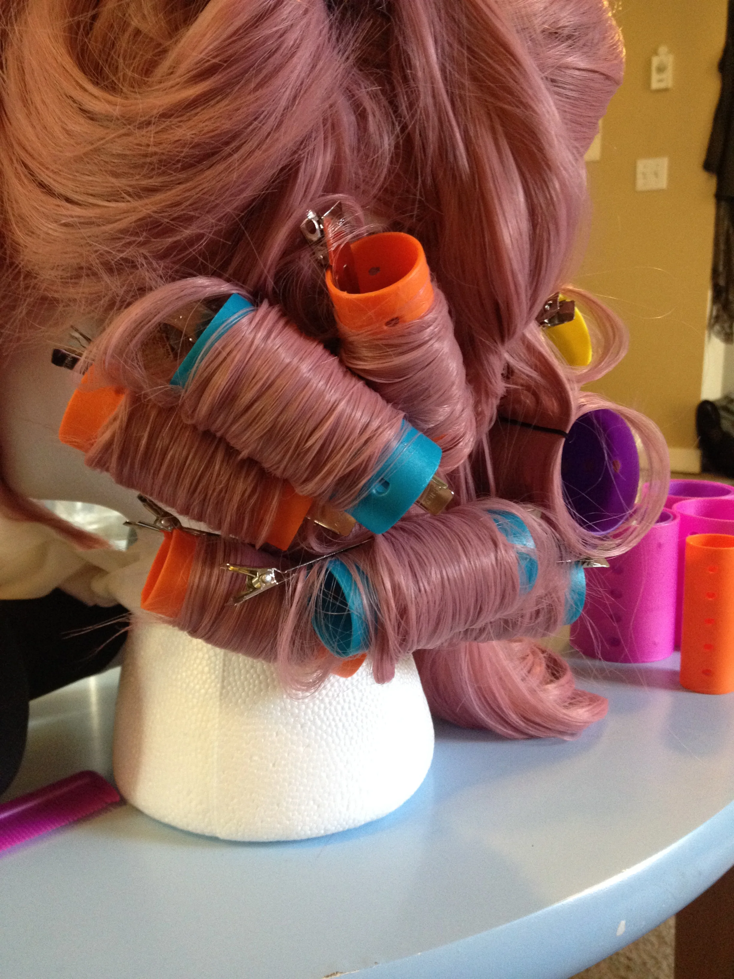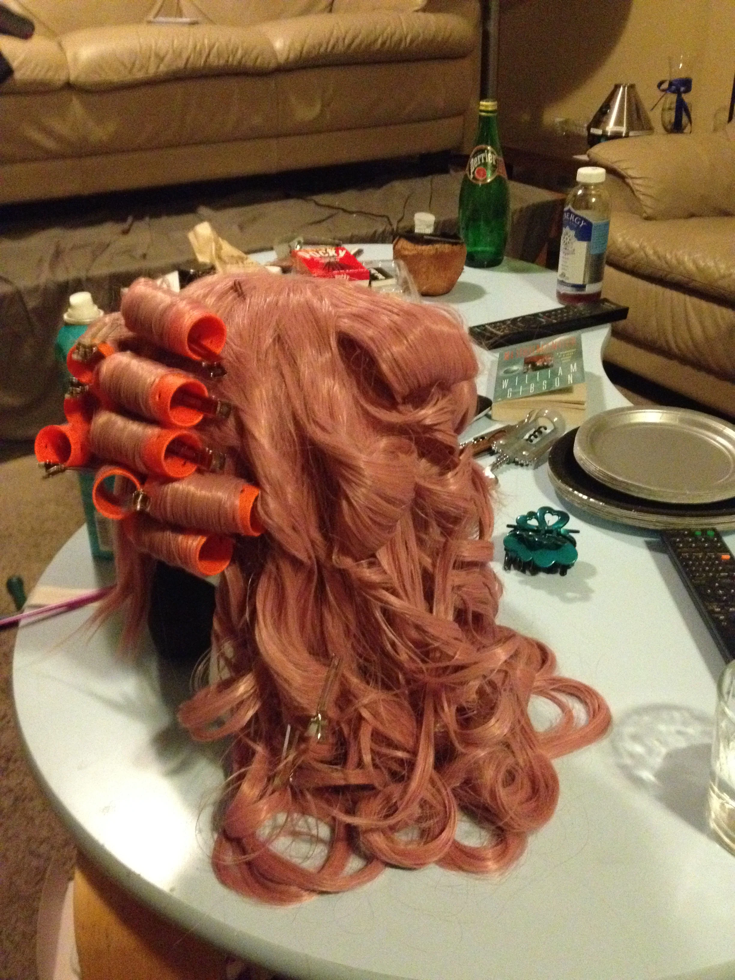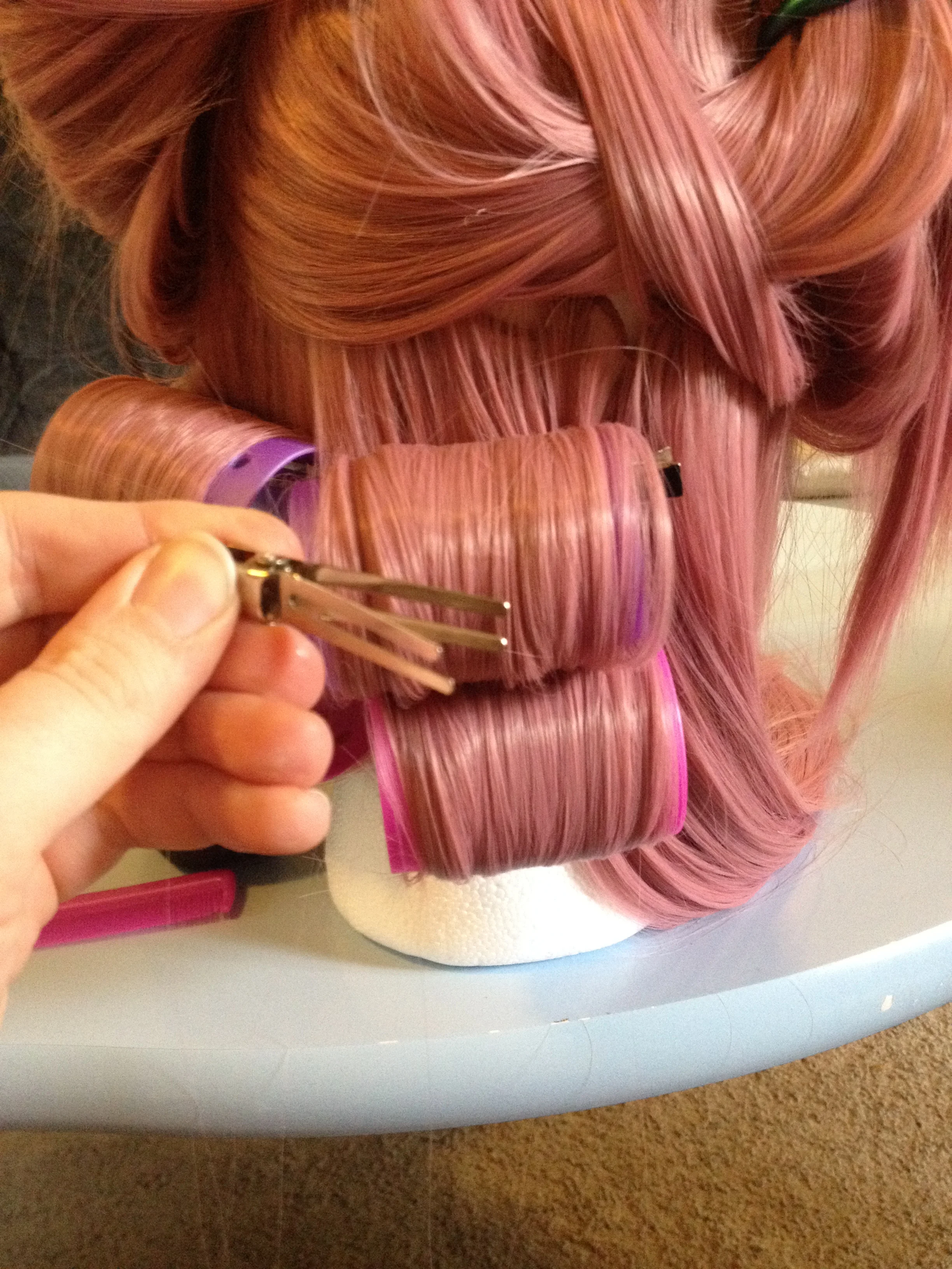 At first, my plan was to follow a youtube tutorial I had found—in that tutorial, the nice lady put the whole wig up in curlers, then placed it into hot water. Unfortunately, it turned out that the curlers set I bought did not have nearly enough clips for me to do that. I tried to use bobby pins to make up the difference, but I only had a limited supply of those, too.