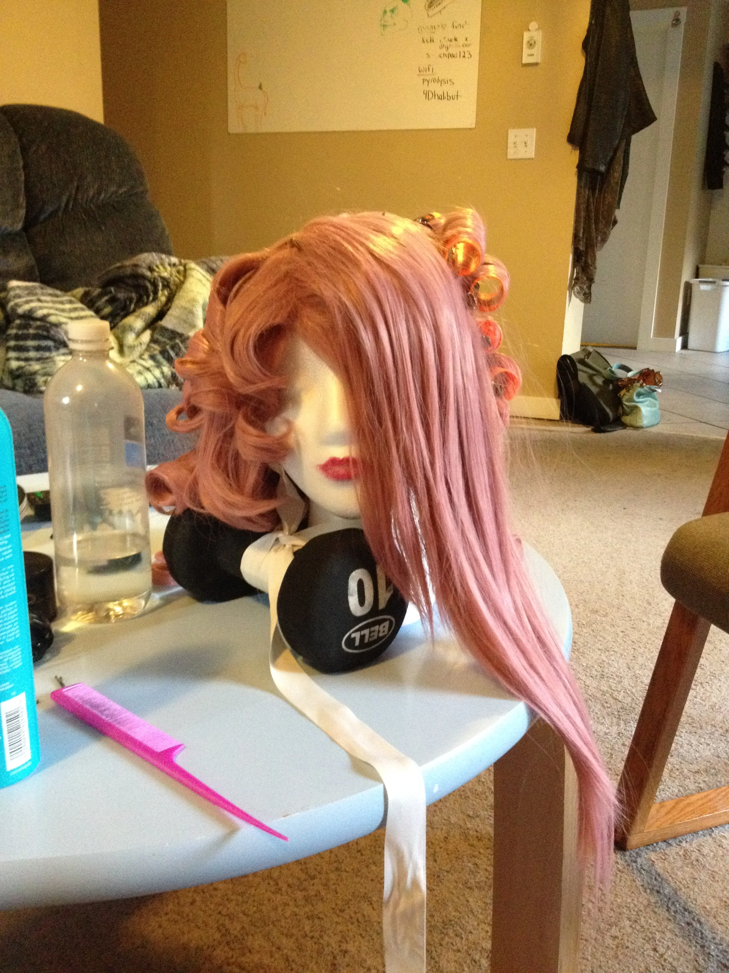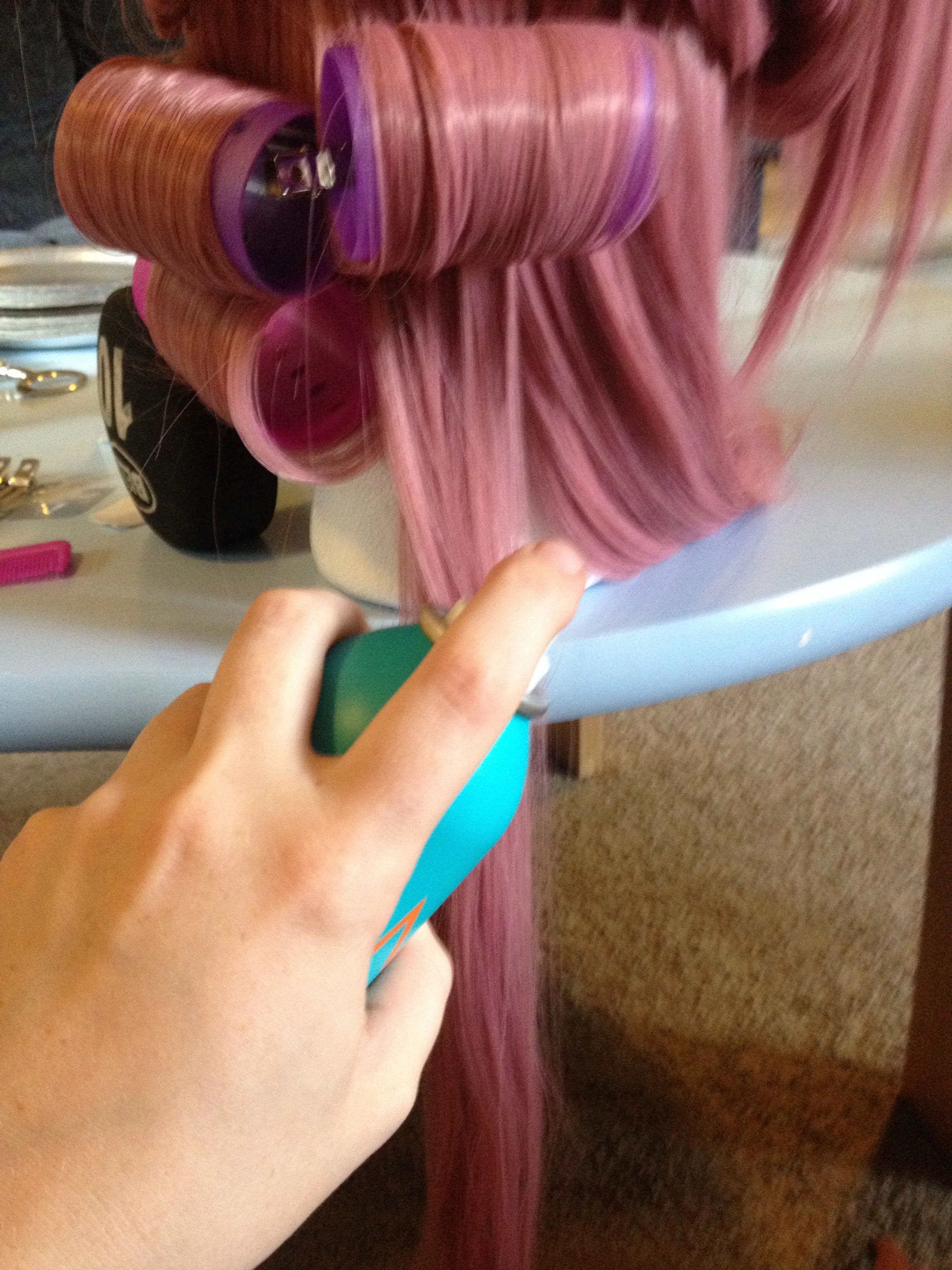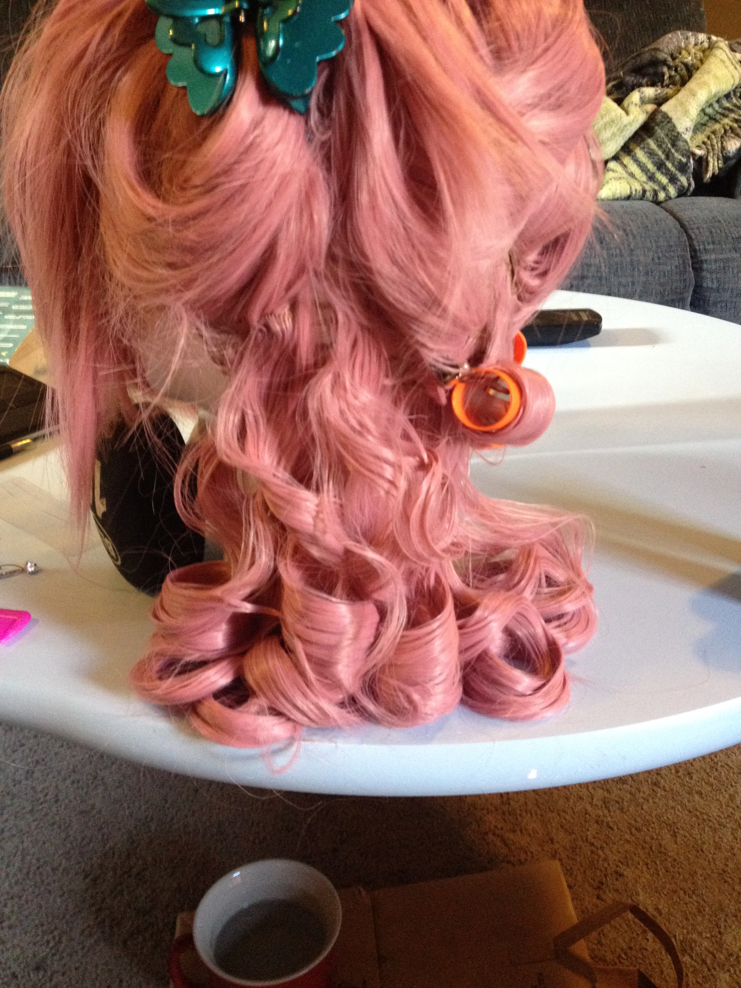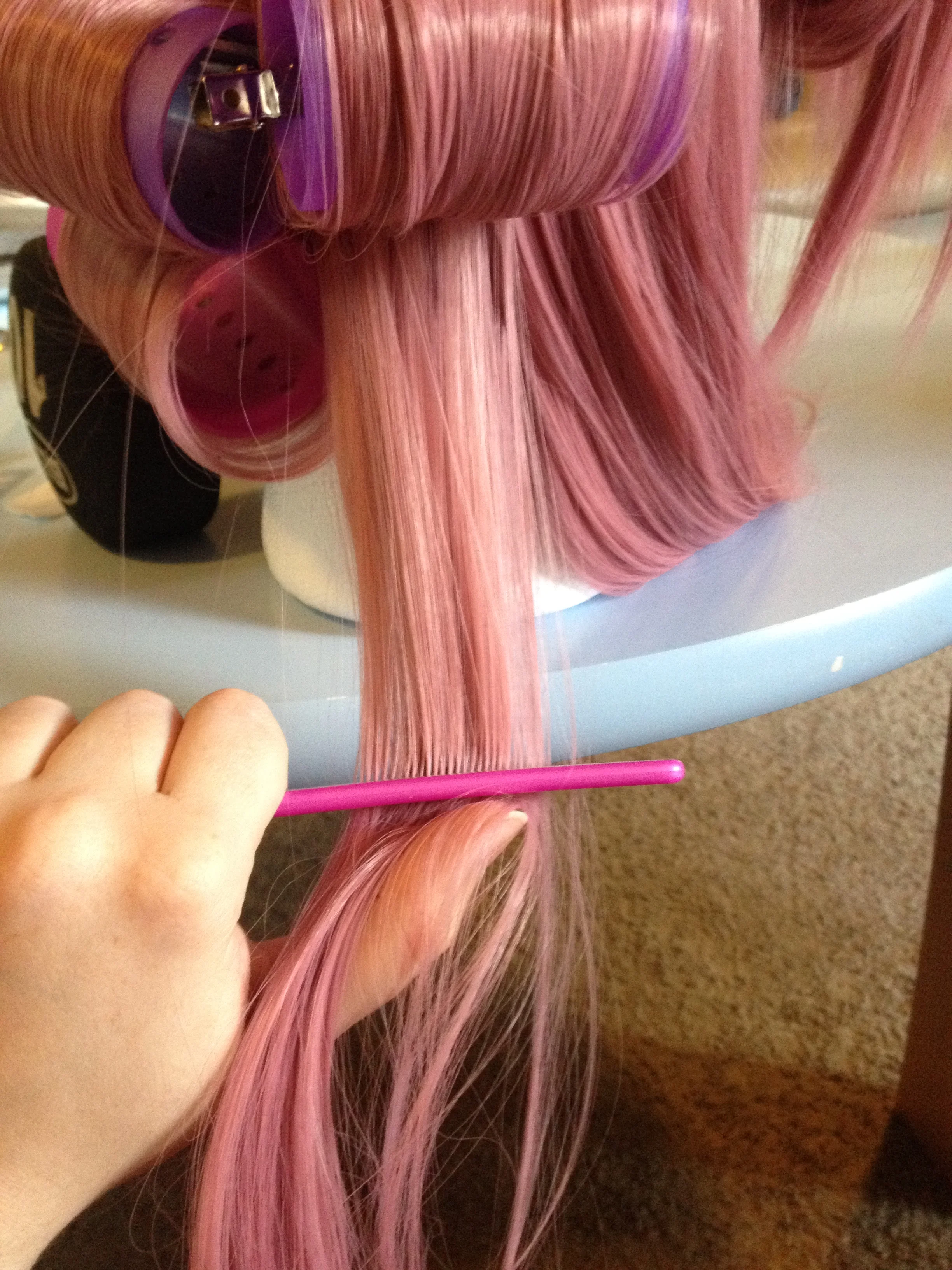 At first, my plan was to follow a youtube tutorial I had found—in that tutorial, the nice lady put the whole wig up in curlers, then placed it into hot water. Unfortunately, it turned out that the curlers set I bought did not have nearly enough clips for me to do that. I tried to use bobby pins to make up the difference, but I only had a limited supply of those, too.